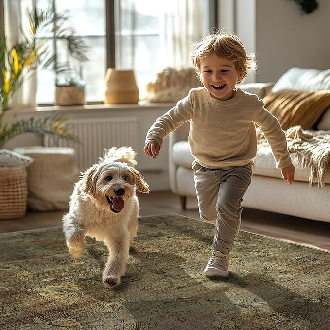 GENIMO 6x9 Area Rugs for Living Room, Machine Washable Non Slip Vintage Rugs, Low Pile Lightweight Chenille Print Rug for Bedroom, Dining Room, Home Office, Moss Taupe