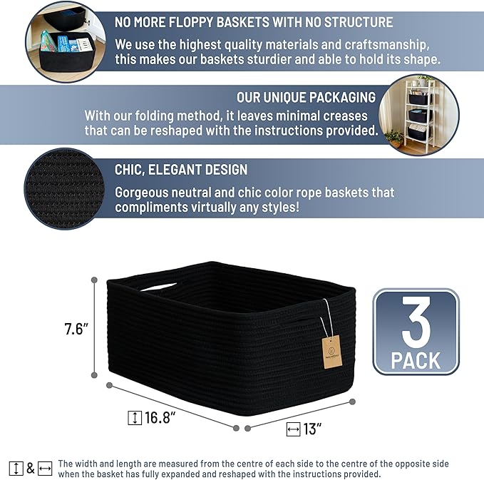 NaturalCozy Storage Baskets 16.8”x13”x7.6” Cotton Rope Woven Baskets for Organizing 3-Pack | Toy Storage Bins | Basket for Shelves, Laundry, Blanket, Clothes, Closet, Kitchen, Bathroom, Gifts