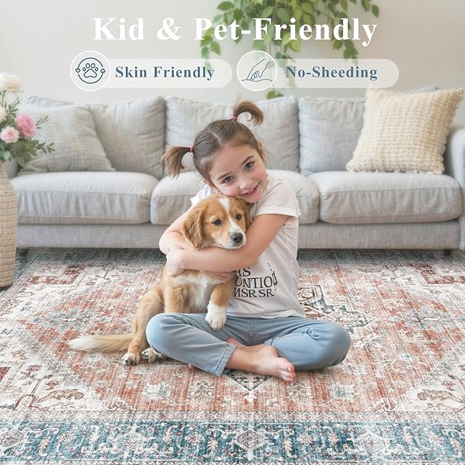 - [Foldable Soft Rug]: Washable 8x10 rug folds without leaving creases for easy seasonal storage.Chic boho and retro large area rug featuring gorgeous patterns printed on soft & cozy short pile for a velvety touch. A gentle mix of terracotta and blue rug exudes tranquility and inspires quiet meditation