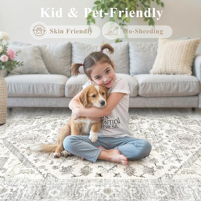 LIVEBOX Washable Area Rug 8x10 - Large Beige Vintage Tribal Living Room Rug Oriental for Bedroom, Non-Slip Retro Medallion Carpet Print Distressed for Dining Room Guest Office