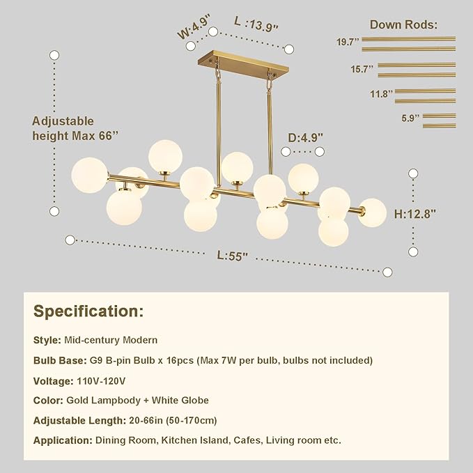- Mid Century Modern Chandelier 55in Linear Gold Pendant Lighting Fixture Linear Chandeliers for Kitchen Island, Dining Room 16-Light