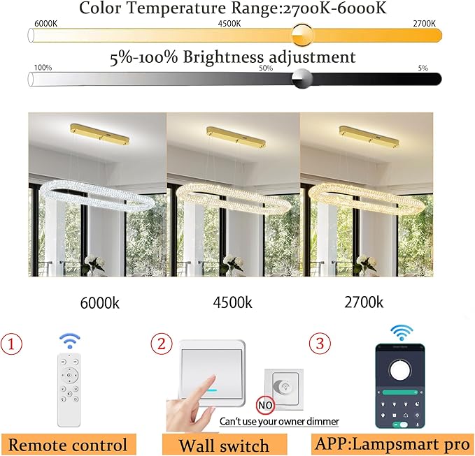 - ✨【Dimmable LED Crystal Ring Chandelier】: 100W.9000Lumens. Including built-in LED light source,and remote control dimmable 3000-6000K color temperature, 5%-100% brightness adjustment,the chandeliers have their own dimmers, which can adjust different light colors according to mood. The AC85-256V voltage can be anywhere.