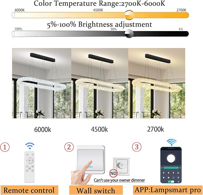 - ✨【Dimmable LED Crystal Ring Chandelier】: 100W.9000Lumens. Including built-in LED light source,and remote control dimmable 3000-6000K color temperature, 5%-100% brightness adjustment,the chandeliers have their own dimmers, which can adjust different light colors according to mood. The AC85-256V voltage can be anywhere.