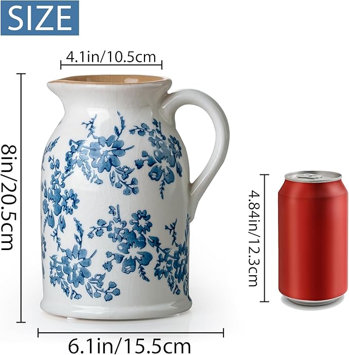 Blue and White Pitcher Vase, 8 Inch Vintage Chinoiserie Ceramic Flower Vase, Rustic Retro Ice Cracked Antique Porcelain Vases for Home Farmhouse Table Centerpieces Shelf Decor