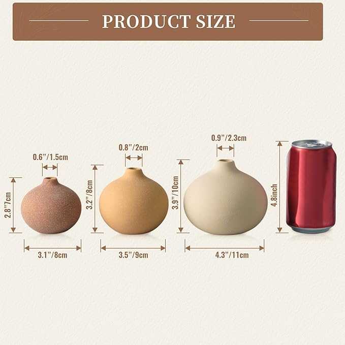 - 【Small Vase Set of 3】 This set includes three small ceramic vases in sizes 4.3" x 3.9", 3.5" x 3.2", and 3.1" x 2.8". Perfect as a centerpiece or for individual displays, these mini vases add a touch of modern farmhouse warmth with minimalist charm to any room.
