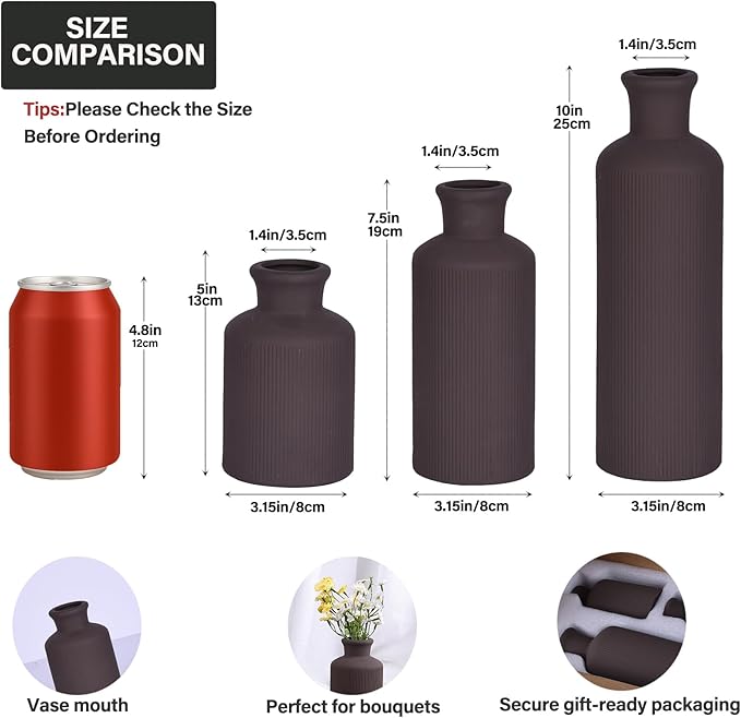 - Rustic Matte Texture – Quiet Elegance in Earthy Tones: This set of ceramic vases for home decor features a timeless matte brown finish with subtle vertical striations. Their minimalist silhouettes and muted earthy tones enhance rustic, farmhouse, or Japandi interiors with understated charm and texture