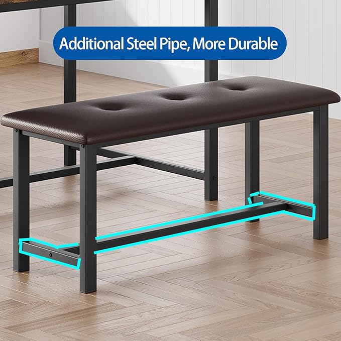 - Ergonomic Comfort with Upholstered Bench: Enjoy exceptional comfort with this dining table set, featuring 2 upholstered dining benches padded with thick cushions for a cozy seating experience. Crafted from premium MDF board and solid steel, the sturdy frame ensures long-lasting durability. Say goodbye to the traditional chairs and embrace the enhanced comfort of our upholstered bench.