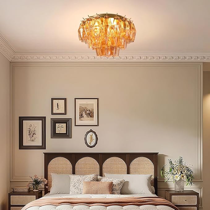 Amber Ceiling Light, 17" Modern Crystal Glass Chandelier for Bedroom, 3-Light Round Flush Mount Ceiling Ligh for Living Room, Bathroom, Hallway, Entryway – Elegant Warm Lighting Fixture