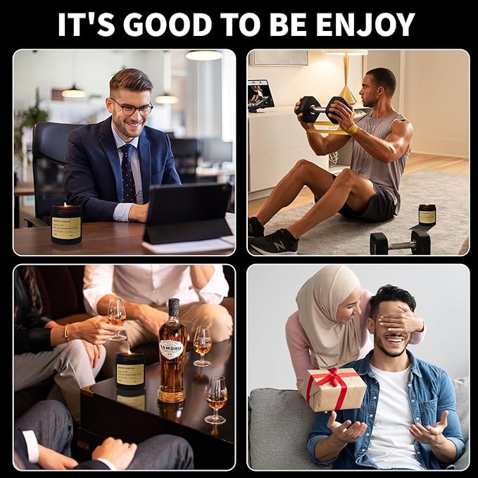 - LONG LASTING SCENT: Enhanced fragrance and excellent diffusion make your living room smell amazing with just one burn. Enjoy this luxury candle made with the finest essential oils to bring you a lasting and strong scent.Candles in black jar and minimalist designs can seamlessly blend into a masculine aesthetic, enhancing the overall ambiance of the room.