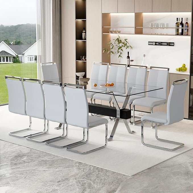 11 Piece Glass Dining Table Set, 79" Modern Dining Table Set for 10, 0.5" Thick Tempered Glass Tabletop with Silver Chrome Metal Legs and Black Crossbar, 10 PU Chairs for Dining Room, Kitchen