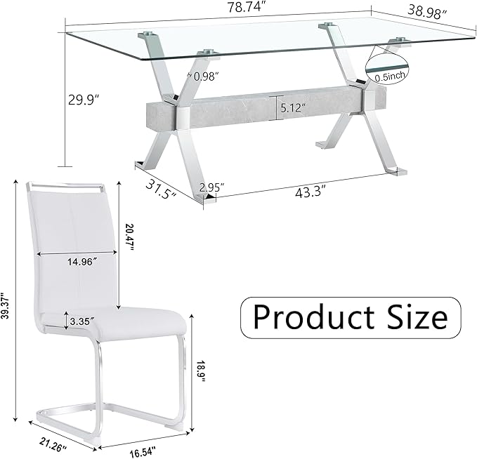 - [Modern Dining Table Set for 10] The tabletop for this kitchen table set is made of 0.5" thick tempered glass, and it has 79" in length, 39" in width, and 30" in height. With the high strength chrome metal tableleg, it can bear up to 500LBS. With the adjustable non-slip footmat, you can move it around without any nosie and match the perfect balance