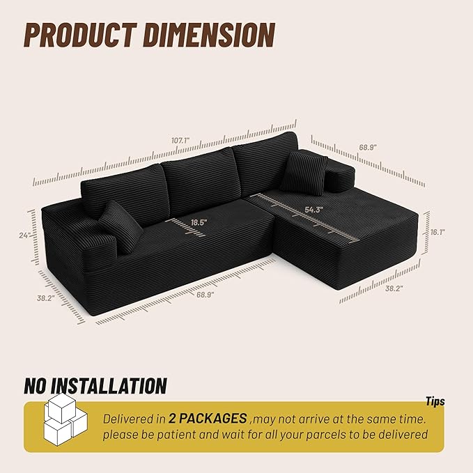 107" Boneless Couch with Deep Seat, Modular Sectional Sofa, Cloud Sectional Couch for Living Room, No Assembly Required, Corduroy, L-Shape Right,Black