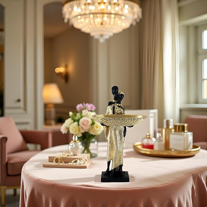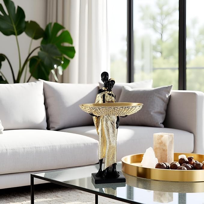 African Couple Resin Tray Sculpture – Black and Gold Decorative Bowl Statue for Entryway, Vanity, Coffee Table, Key Candy Jewelry Holder, Ethnic Art Home Decor Gift