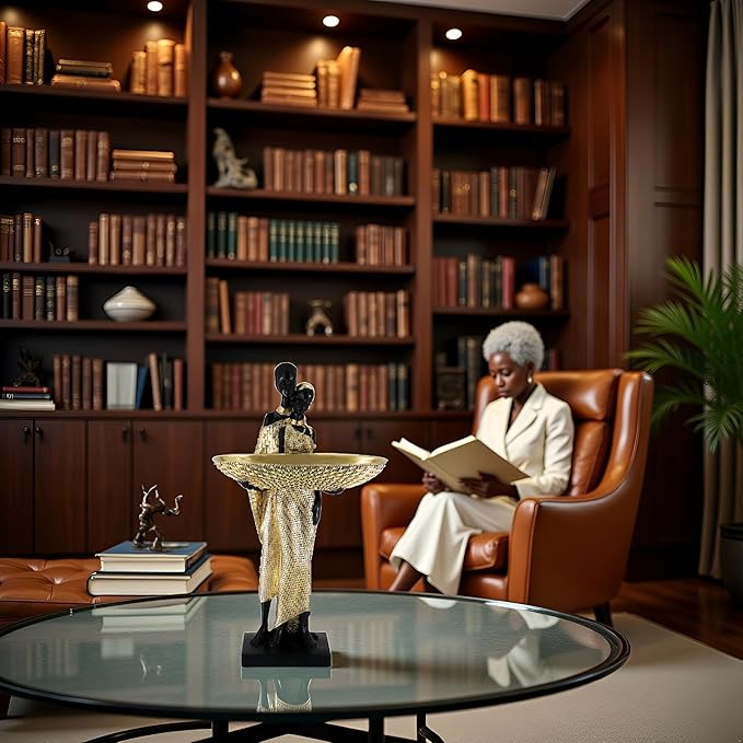 - 【Romantic African Couple Design】This handcrafted sculpture features a tender African couple carrying a large woven-look golden tray. The intertwined posture symbolizes unity, love, and shared responsibilities.