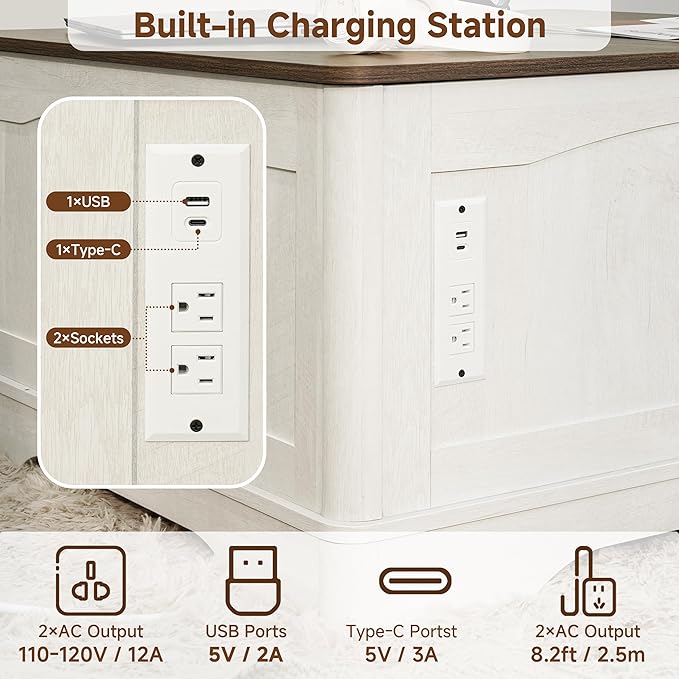 - [Convenient Charging Station] Stay powered up with the built-in charging hub, including 2 AC outlets, 1 USB-C port, and 1 USB-A port. No more messy cords—charge your phone, laptop, or tablet directly from the table.