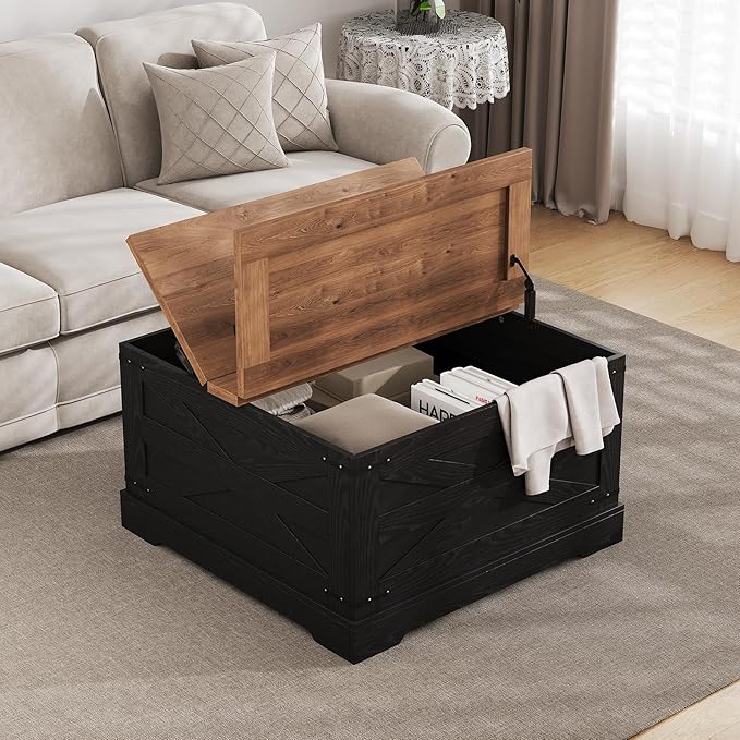 Farmhouse Coffee Table with Hidden Storage, Black Square Coffee Table for Living Room, Wood Large Center Table with Hinged Lift Top for Home, Office