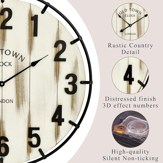 - š” Stylish Farmhouse Design: Enhance your home decor with this 24-inch large wall clock. It features a rich matte white finish and a modern rustic farmhouse style that seamlessly blends with various interiors, from industrial lofts to cozy country kitchens, adding a touch of elegant charm to any space.