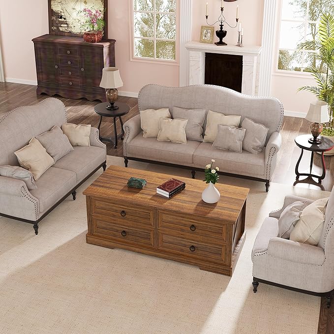 - Coffee Table with 4 Drawers Storage: Coffee tables for living room have 4 large drawers storage with metal pull ring, providing you with enough space to store your blankets, books, snacks, toys, game consoles, etc. With a large 47.24" x 21.65" tabletop, the wood coffee table offers ample space for work, study, dining, or guests around center table to enjoy time.