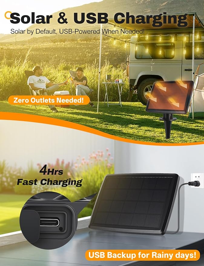 - Solar + USB Dual Charging:quipped with a high-efficiency solar panel that energy efficiency increased by 20%,it can be fully charged in just 6H on sunny day.What about consecutive cloudy or rainy days? Usb 4H fast charging is super convenient.Both Both methods keep your backyard or balcony lit for over 10H every night! No need to lay wires,don't worry about cloudy days and power outages,eco-friendly and hassle-free,Your outdoor space stays lit 365 days a year.