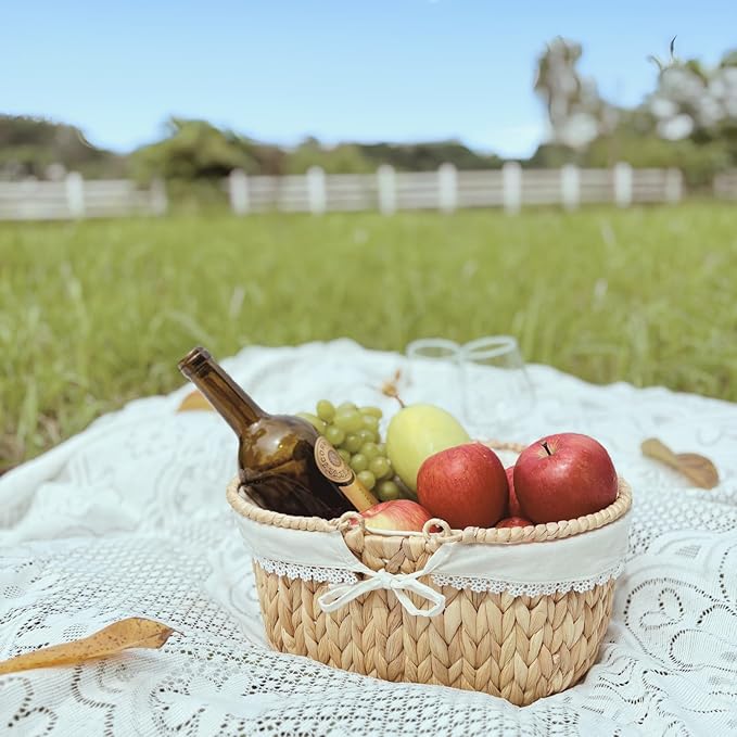 Wicker Basket with Handles and Lining, Handwoven Water Hyacinth Picnic Hamper, Oval Basket for Camping, Outdoor, Fruit, Wine, Thanksgiving day, Birthday, Easter, Gift, Home Decor