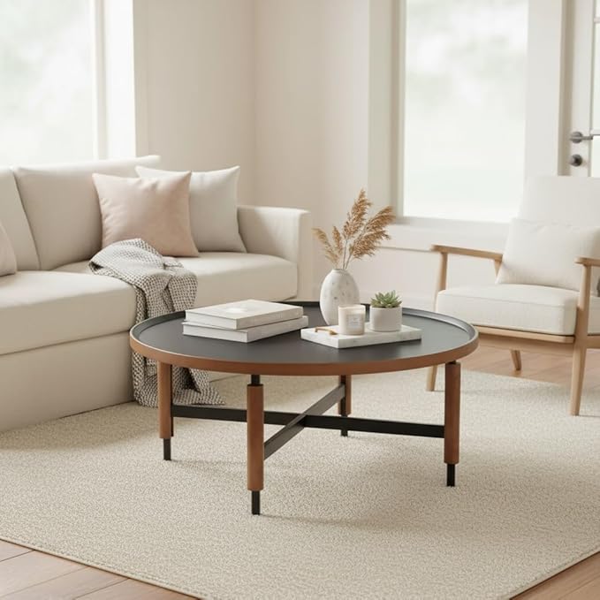 - Modern Design: Round coffee table featuring a sleek wooden top with black cross legs base, creating a perfect blend of rustic and contemporary aesthetics for your living space