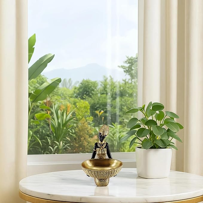 African Tribal Resin Statue - Handcrafted Gold Accent Figure with Bowl, Ethnic Home Decor Art Piece for Shelf & Table Display, Bohemian Gift Idea
