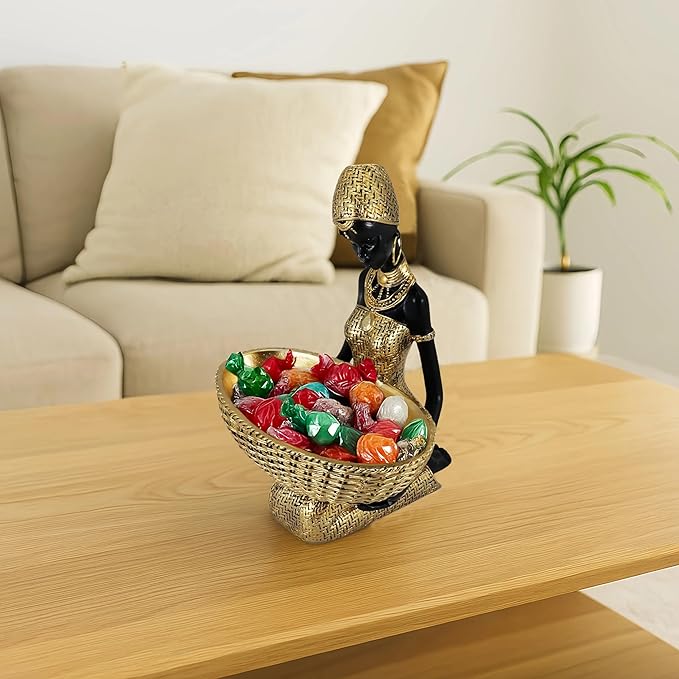 - š | Culturally Rich Craftsmanship:Exquisite African-inspired resin statue featuring intricate woven texture garments & exaggerated gold accessories, kneeling pose holding functional gold bowl container.