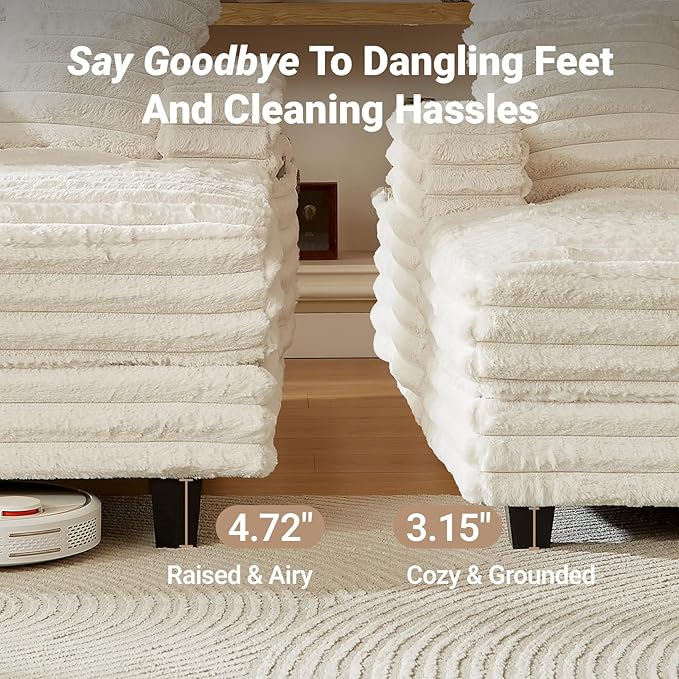 - [Two Sets of Sofa Legs]: This oversized chair comes with two sets of interchangeable legs: a 3.15in (8cm) set and a 4.72in(12cm) set, allowing you to customize the height to fit your comfort level and needs. Whether you prefer a lower, lounge-style feel or a higher seat for easy access, this thoughtful design adapts to you. Plus, the 4.72in(12cm) height provides enough clearance for a robotic vacuum, making cleaning underneath effortless.