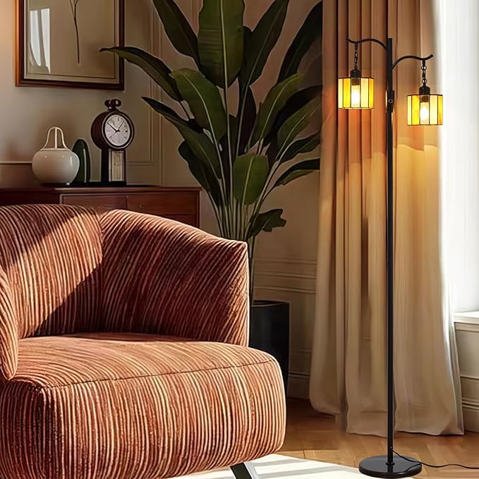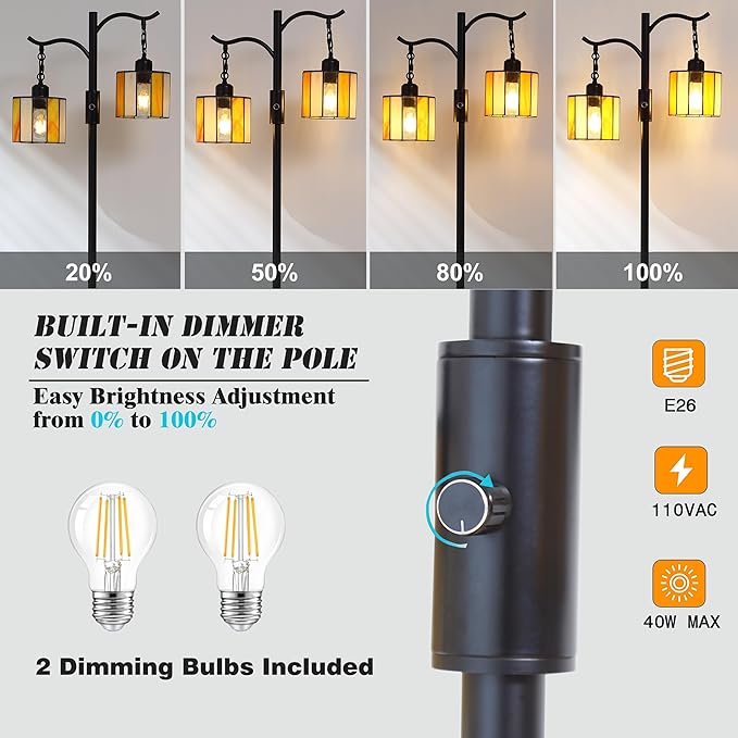 - 【Elegant Minimalist and Classical Appearance】The vintage Dimming tiffany floor lamp Illuminate your space in classic style. 65'' farmhouse rustic tall pole lamp is crafted of solid metal frame and 2 Tiffany-inspired glass shades, it is an ideal choice for your home with the convenient matching footswitch. This stained glass standing lamp is a great present for parents or friends.You can choose different wattage E26 Dimming bulbs for the living room lamps according to your need