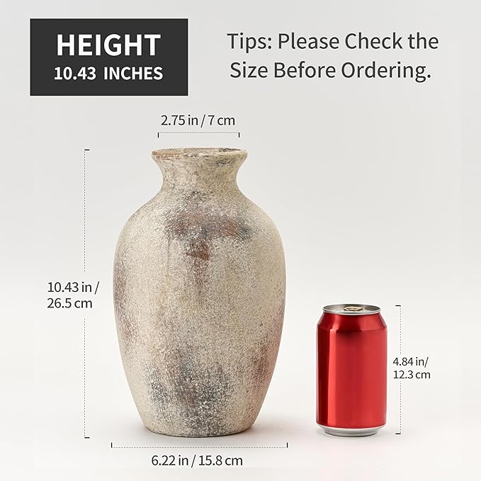 - Non-Slip Bottom Vase: This rustic vase for home decor measures 6.22" W x 10.43" H with a mouth diameter of 2.75", and is ideal for displaying artificial flowers, dried florals and fresh flowers. The bottom of the pottery vase is equipped with a non-slip pad, which prevents the flower vase from scratching the table or floor during movement during placement.