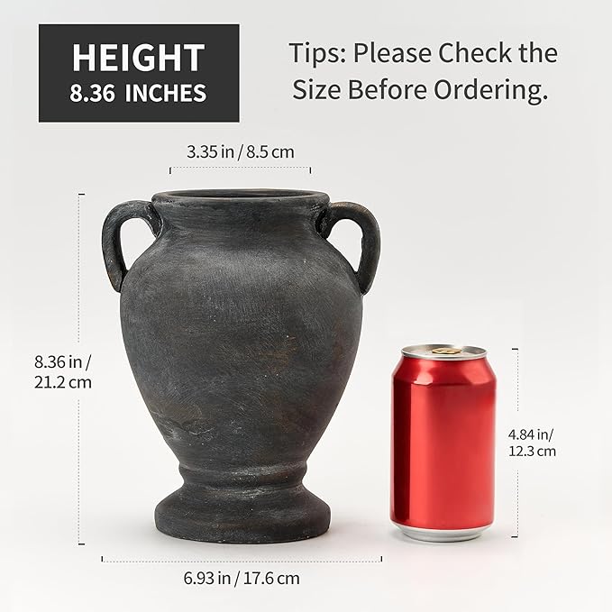 Ceramic Rustic Flower Vase with Handles, 8.36 Inch Tall Vintage Pottery Home Decor, Farmhouse Terracotta Vase for Living Room, Table, Shelf, Mantel Decoration, Farmhouse- Black