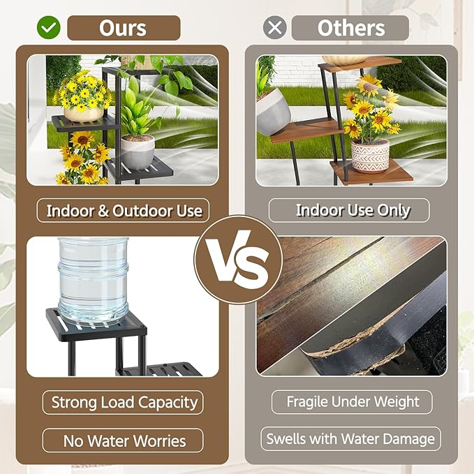 - 【Solid Feel You Can Trust】Worried about unstable stands tipping over? Crafted from upgraded metal that's 30% stronger than typical stands, the plant rack holds even heavy 9-inch pots with ease—no wobble, no tipping. From the moment you unbox it, you’ll feel the difference.