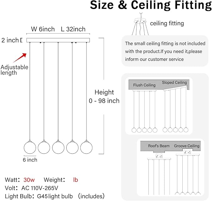 - 【Globe Chandelier Size】Modern Chandelier ceiling plate :L32"x W 6" x H 2", Chandelier max height: 98inch.Glass size:W 6inch * H 6inch,