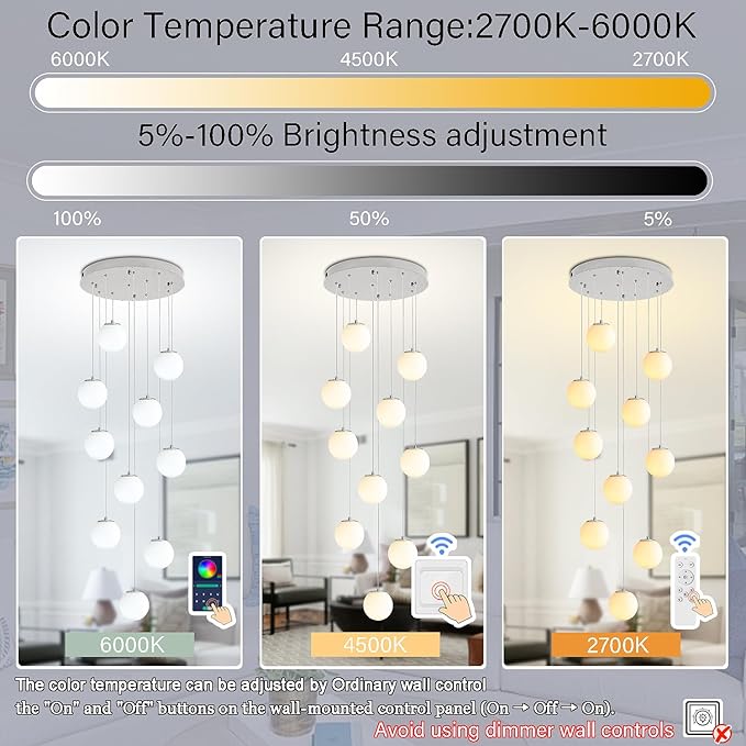- 【Smart Hanging Chandelier 】It is equipped with a remote control and APP control for seamless dimming between warm white (2700K) and cold white (6000K), as well as adjustable brightness ranging from 5 to 100 percent.