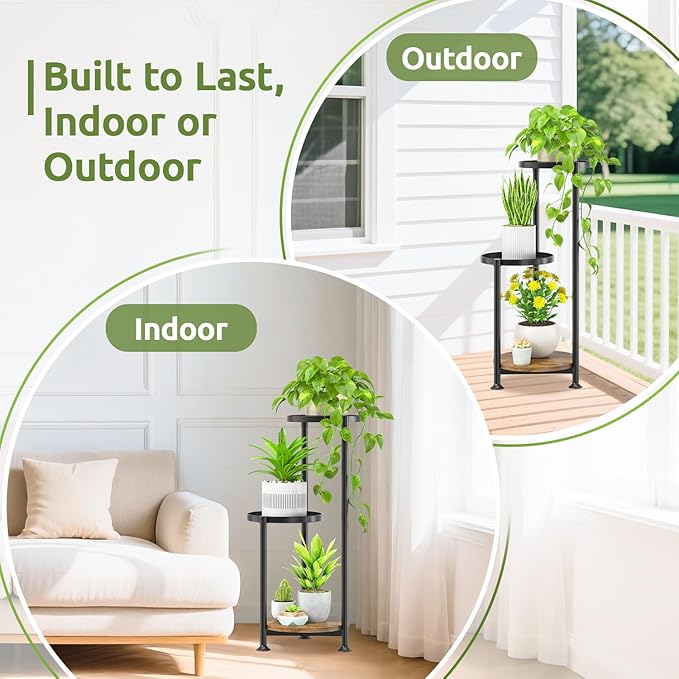 - [Built to Last, Rain or Shine] Crafted with a sturdy iron frame and a rust-proof, waterproof finish, this large plant holders is built to withstand extreme weather, indoor or outdoor. The triangular design ensures rock-solid stability, while the widened iron trays support up to 60 lbs and thickened wood boards hold an impressive 100 lbs—perfect for your heaviest plants!