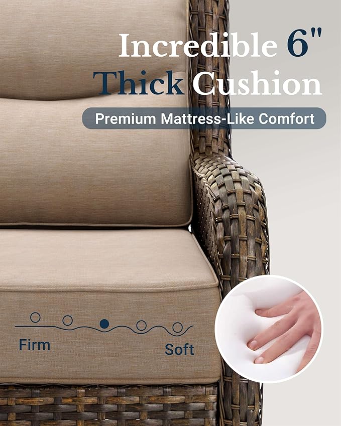 • 6-Inch Extra Thick Cushion: Each cushion of our patio swivel chair and sofa is made of 6-inch thick, 28D high-density foam, so you get 40% more comfort, 30% better bounce, and 2x the durability of standard 4-inch cushions. No sagging, just support