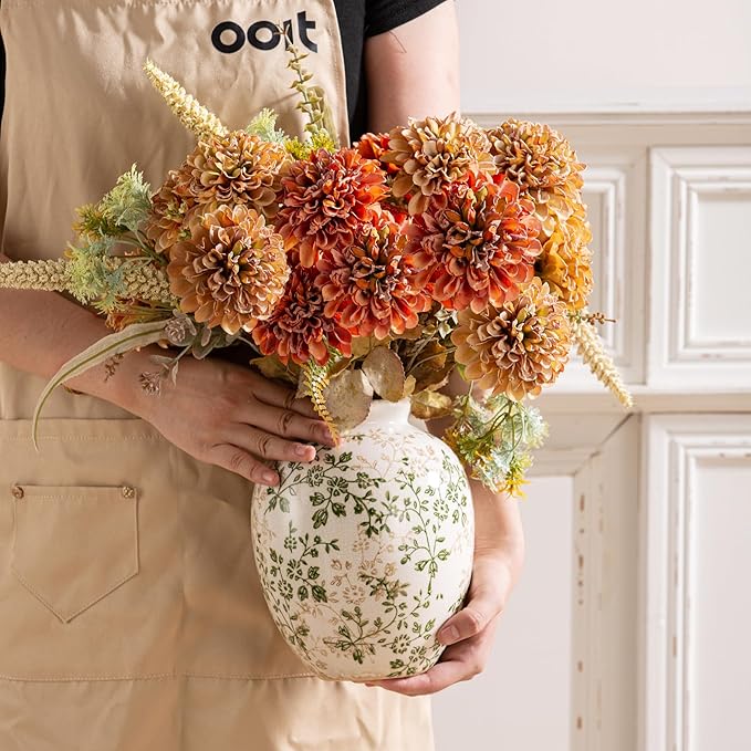 Ceramic Rustic Vase, Green and Beige Flower Vintage Decorative Vase Chinoiserie Decor Rustic Farmhouse Retro Floral Vases for Table Bookshelf Mantel Kitchen Living Room Office- 7.8inch
