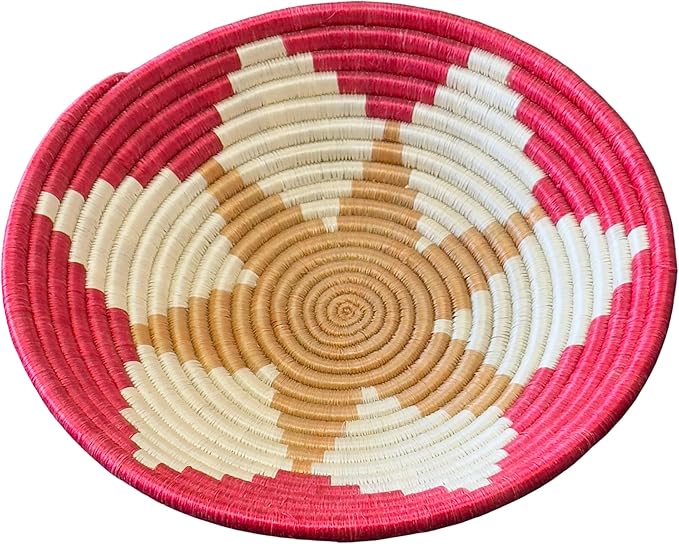 Handwoven African Basket Handmade sisal Fruit Bowl Wall Hanging decorative Baskets for Home Living Room Kitchen Centerpiece Zen Designs Arts and Crafts (Red White Tan, 12in diameter)