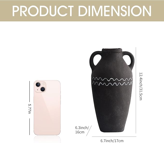 - Ceramic Material: Handcrafted black ceramic vase with dual handles and decorative wavy pattern, perfect for rustic farmhouse decor, its beautiful design and exquisite craftsmanship will make an impressive decorative piece