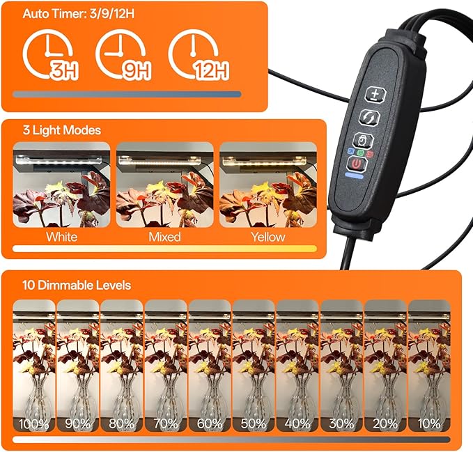 - One-to-Four Light Bar with Scheduling - This corner plant stand integrates a four-head grow light bar featuring three spectral modes (yellow/mixed/white) and ten dimming settings. The timer offers 3/9/12-hour cycle options for consistent daily lighting, supporting plant maintenance with minimal manual adjustment