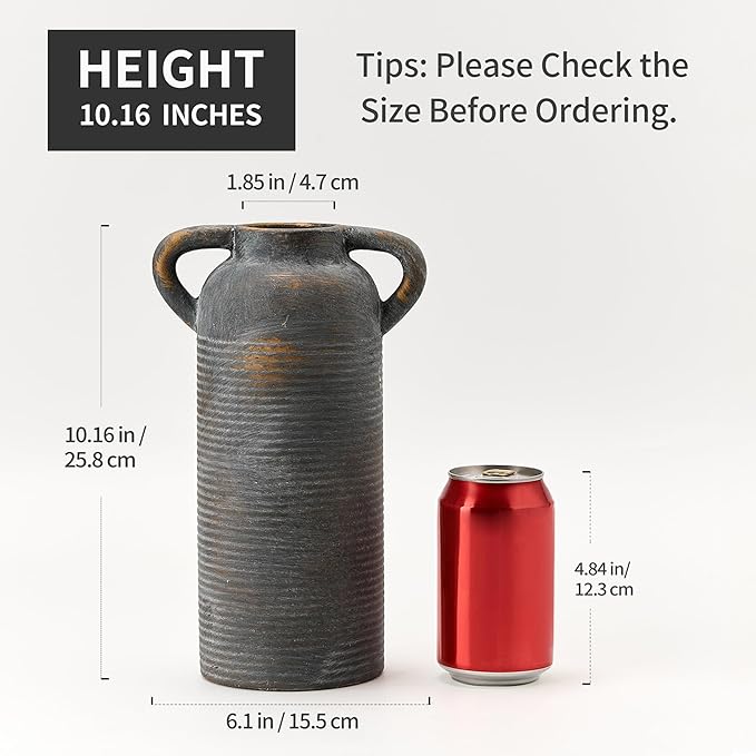 10.16" Tall Ceramic Rustic Vase for Home Decor, Terracotta Vase with Handles, Handcrafted Vintage Decorative Flower Vase for Farmhouse, Living Room, Table, Fireplace, Nightstand- Black Bronze