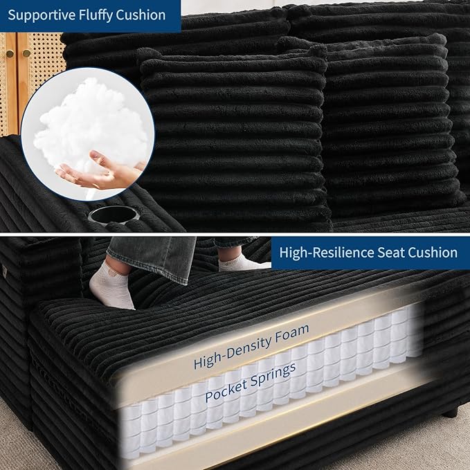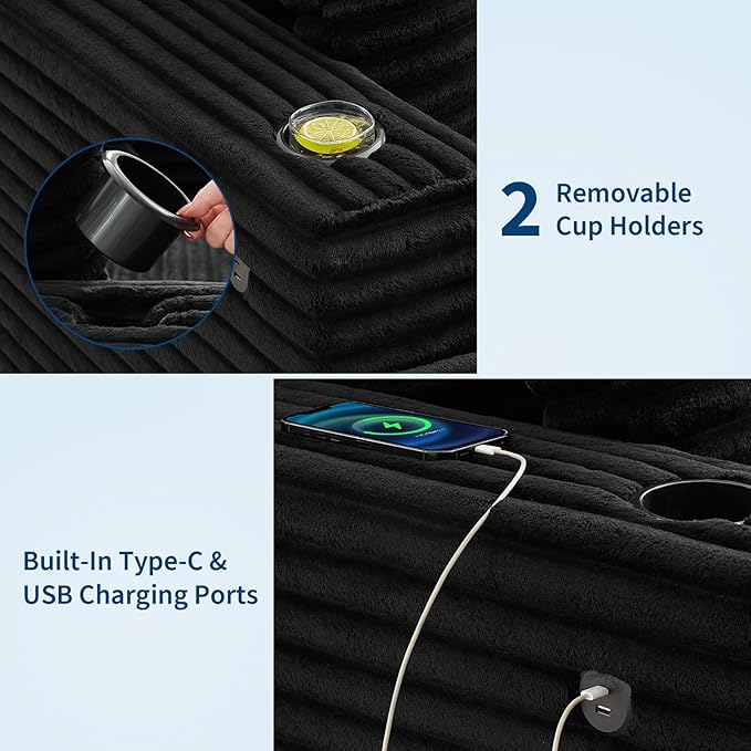 GarveeHome Oversized Chaise Lounge Chair Indoor, 56x60 Inch Comfortable Corduroy Lounge Sofa with Charging Ports & Cup Holders, Cozy Reading Couch for Bedroom Living Room Apartment, Black