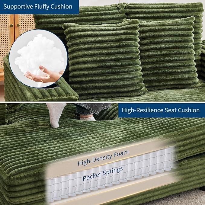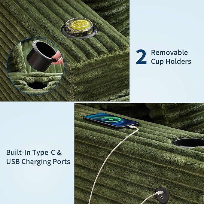 GarveeHome Oversized Chaise Lounge Chair Indoor, 56x60 Inch Comfortable Corduroy Lounge Sofa with Charging Ports & Cup Holders, Cozy Reading Couch for Bedroom Living Room Apartment, Green