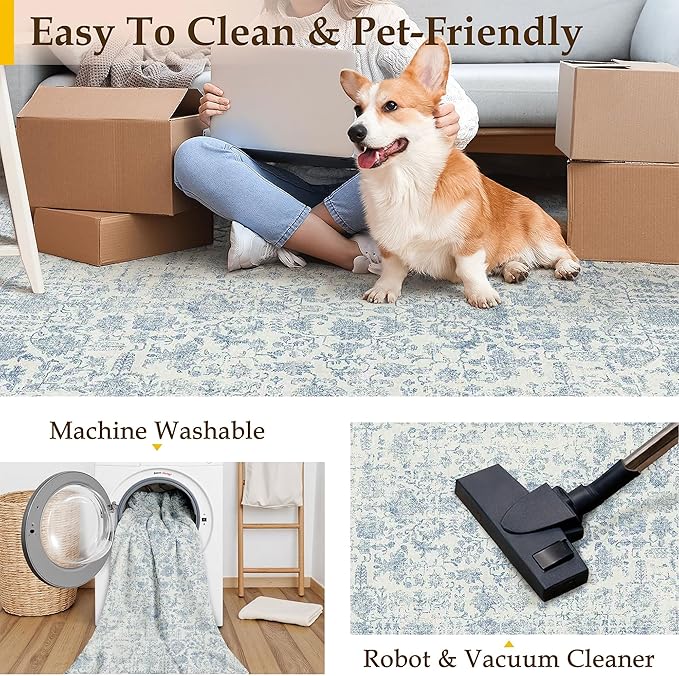 Blue Area Rug 5x8 Machine Washable Vintage Living Room Distressed Non Slip Carpet Traditional Indoor Bedroom Retro Floral Accent Throw Large Rug Office Kitchen Bathroom Dining Room
