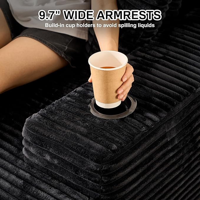 - User-friendly Design: The lounge sofa has wide armrests, providing loose arm support and space for placing items. Each armrest includes a build-in cup holder to keep your drinks, remote or phone within arm’s reach. Three pillows in the back greatly fits the curves of the neck, back and lumbar, giving you endless comfort.