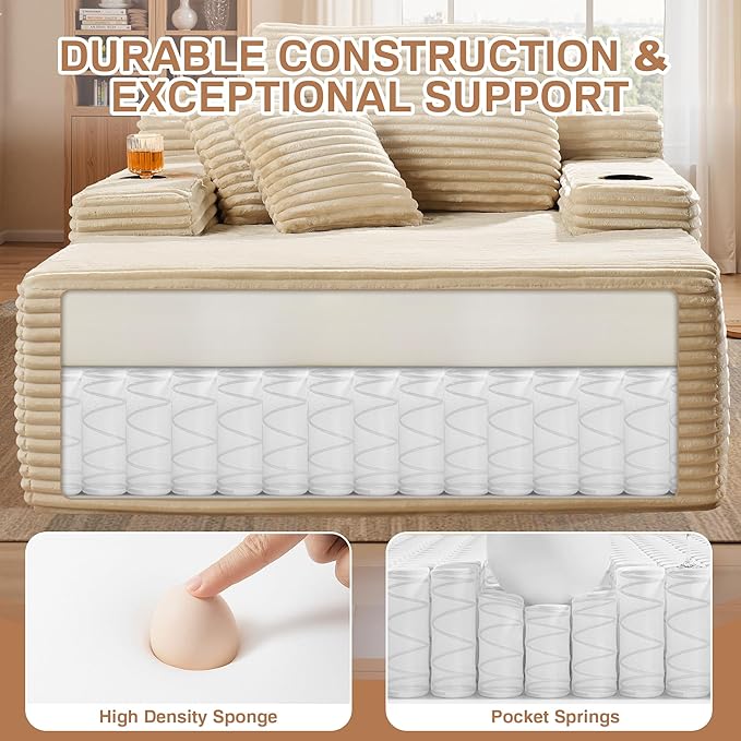 - Reliable Support: The cushion of the recliner bed combines high-performance pocket springs and high-density foam, which effectively disperses pressure and preventing deformation, ensuring long-lasting durability and excellent support. The doll cotton wrapped inside the pillows greatly improves the comfort.
