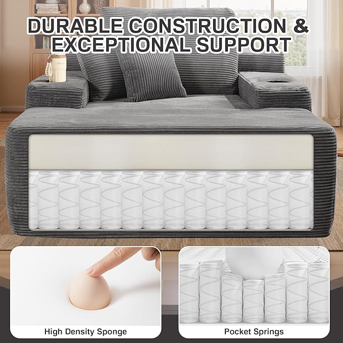 Chaise Lounge Chair Indoor, 67" Oversized Comfy Corduroy Sleeper Sofa Bed with Cup Holders and Wide Armrests, Boneless Upholstered Recliner Bed, Modern Cloud Couch for Living Room, Grey