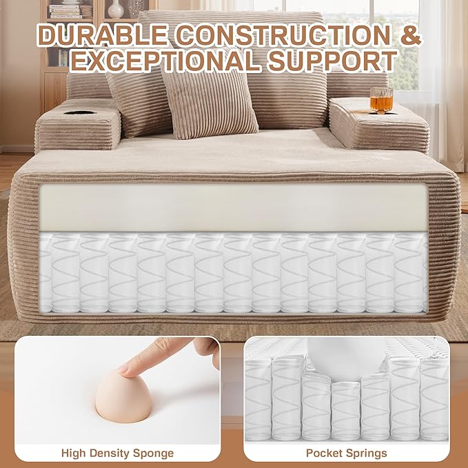 Chaise Lounge Chair Indoor, 67" Oversized Comfy Corduroy Sleeper Sofa Bed with Cup Holders and Wide Armrests, Boneless Upholstered Recliner Bed, Modern Cloud Couch for Living Room, Camel
