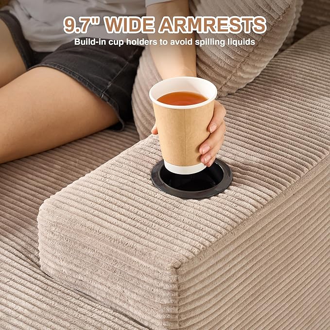 - User-friendly Design: The lounge sofa has wide armrests, providing loose arm support and space for placing items. Each armrest includes a build-in cup holder to keep your drinks, remote or phone within arm’s reach. Three pillows in the back greatly fits the curves of the neck, back and lumbar, giving you endless comfort.