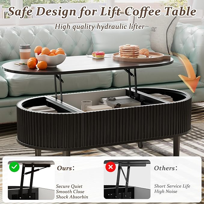 EAG Fluted Lift Top Coffee Table with Hidden Compartment, 39 Inch Modern Oval Coffee Table with 3 Storage, Fully Wooden Assembled Center Table for Living Room, Office, Black